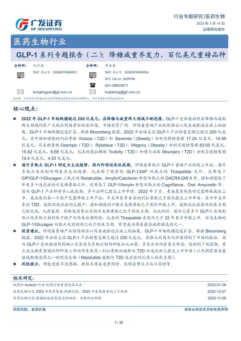 医药生物行业GLP-1系列专题报告(二):降糖减重齐发力,百亿美元重磅品种