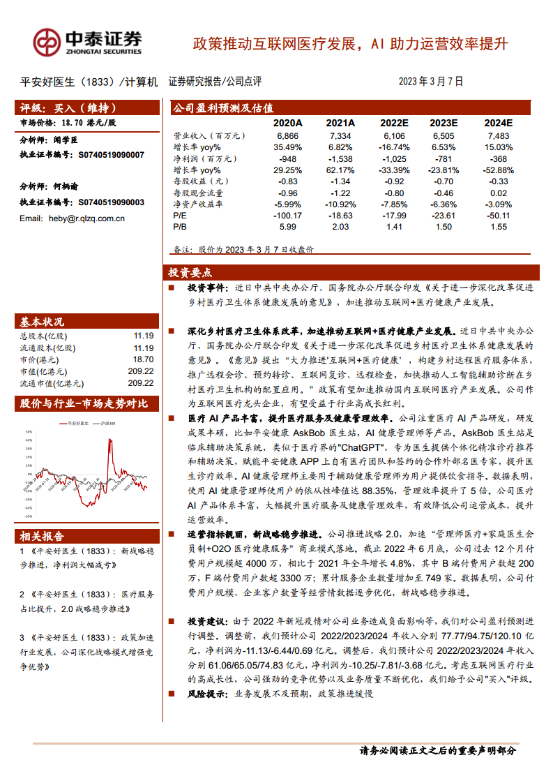 在国家政策大力支持“互联网+医疗健康”和人工智能应用于乡村医疗的背景下,平安好医生作为行业龙头,正通过其丰富的医疗AI产品(如AskBob医生站和AI健康管理师)显著提升医疗服务效率和运营管理水平。公司2.0战略的稳步推进已带来付费用户和企业客户数量的持续增长。尽管2022年受疫情影响导致盈利预测有所调整,但基于互联网医疗行业的高成长性、公司强大的竞争优势以及业务质量的不断优化,分析师维持了“买入”评级,认为平安好医生未来有望持续受益于行业发展红利,并逐步改善其财务表现。
