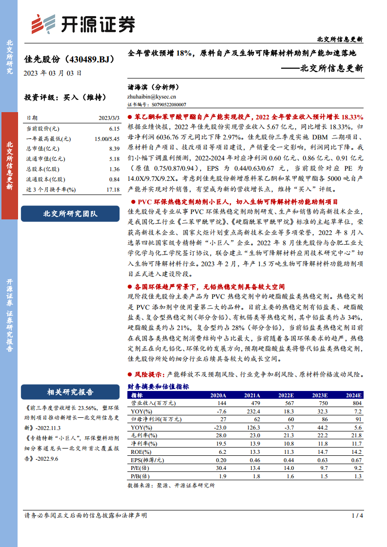 佳先股份是专注于PVC环保热稳定剂助剂研发、生产和销售的高新技术企业,是《二苯甲酰甲烷》和《硬脂酰苯甲酰甲烷》国家标准的主起草单位,并于2022年8月入选第四批国家级专精特新“小巨人”企业。为顺应行业发展趋势,公司于2022年8月与合肥工业大学化学与化工学院合作建立“生物可降解材料应用技术研究中心”,正式切入生物可降解材料行业。2023年2月,年产1.5万吨生物可降解材料功能助剂项目已进入建设阶段,有望为公司带来新的增长极。