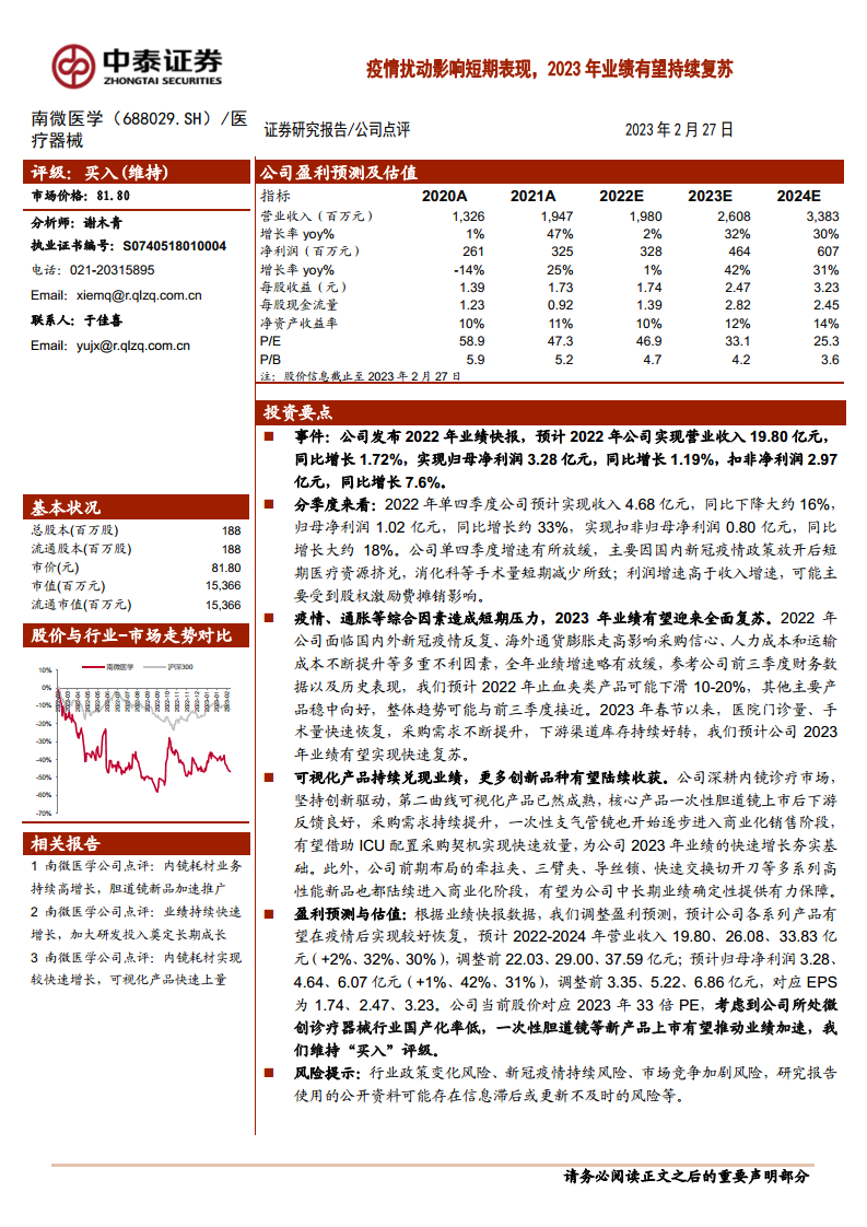 南微医学在2022年面临疫情、通胀等多重外部压力,导致全年及第四季度业绩增速放缓,但归母净利润仍实现小幅增长。展望2023年,随着国内医疗活动的快速恢复,公司业绩有望实现强劲复苏。同时,公司在内镜诊疗领域的持续创新,特别是可视化产品(如一次性胆道镜和支气管镜)以及其他高性能新品的商业化,将成为其未来业绩增长的核心驱动力。尽管盈利预测有所调整,但考虑到行业国产化率低的背景和新产品的增长潜力,报告维持“买入”评级,并提示了行业政策、疫情持续及市场竞争等潜在风险。