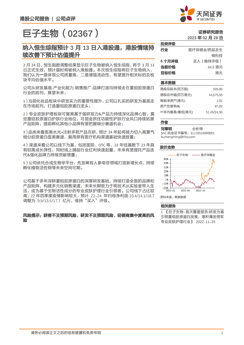巨子生物凭借其在重组胶原蛋白领域的深厚研发基础和全面的产业化能力,已在专业皮肤护理市场确立龙头地位,并通过多品牌战略和医美赛道拓展,展现出显著的增长潜力。公司多元化的线上线下渠道布局以及合成生物学平台孵化的新增长点,共同构筑了其可持续发展的核心动力。近期被纳入恒生综指,预计将有效提升市场流动性和估值。尽管短期盈利预测因疫情影响有所调整,但公司长期发展前景依然乐观,维持“买入”评级,但投资者需关注获客、研发及经销商集中度等潜在风险。