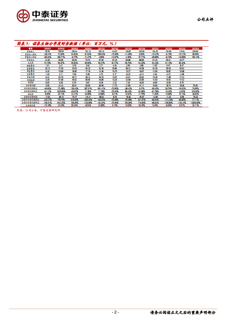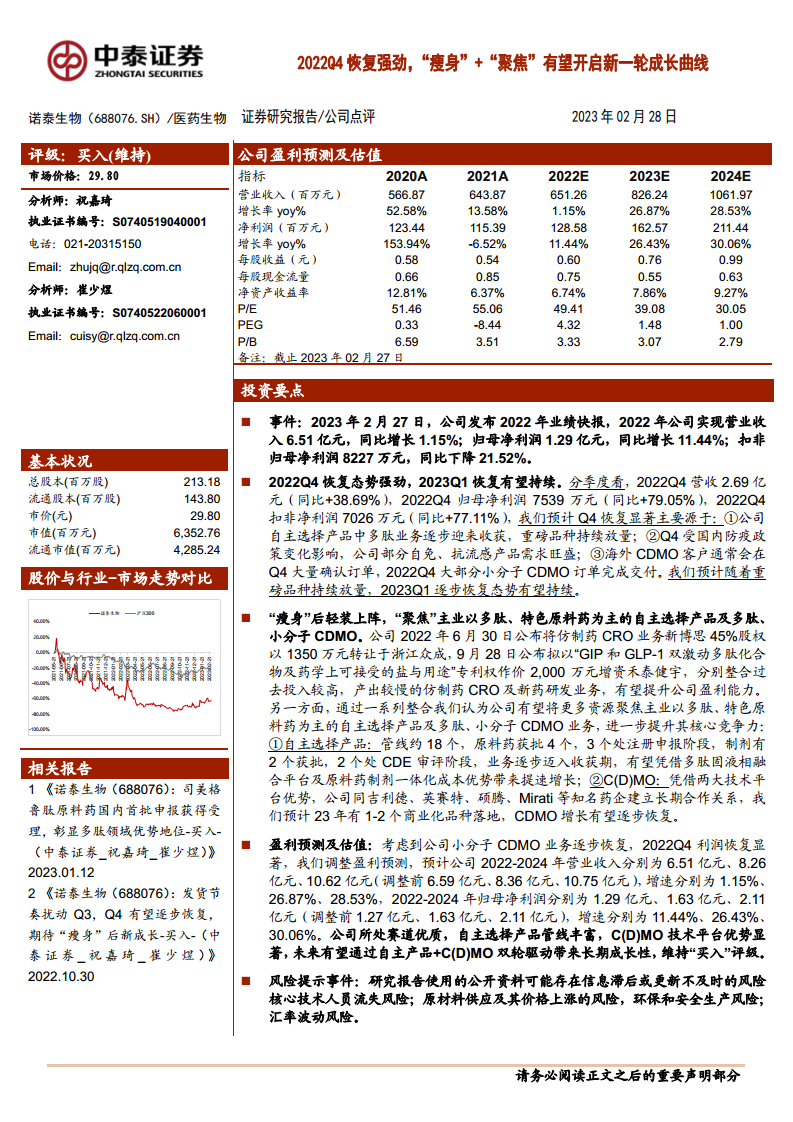 诺泰生物在2022年第四季度实现了强劲的业绩反弹,全年营收和归母净利润均实现增长。公司通过剥离非核心业务并聚焦于多肽、特色原料药的自主选择产品及CDMO业务,优化了战略布局,提升了核心竞争力。凭借丰富的产品管线和技术平台优势,公司有望在未来实现自主产品与CDMO业务的双轮驱动增长。尽管面临市场、运营、研发和人才等多方面风险,但其优质赛道和战略调整为长期成长奠定了基础,因此维持“买入”评级。