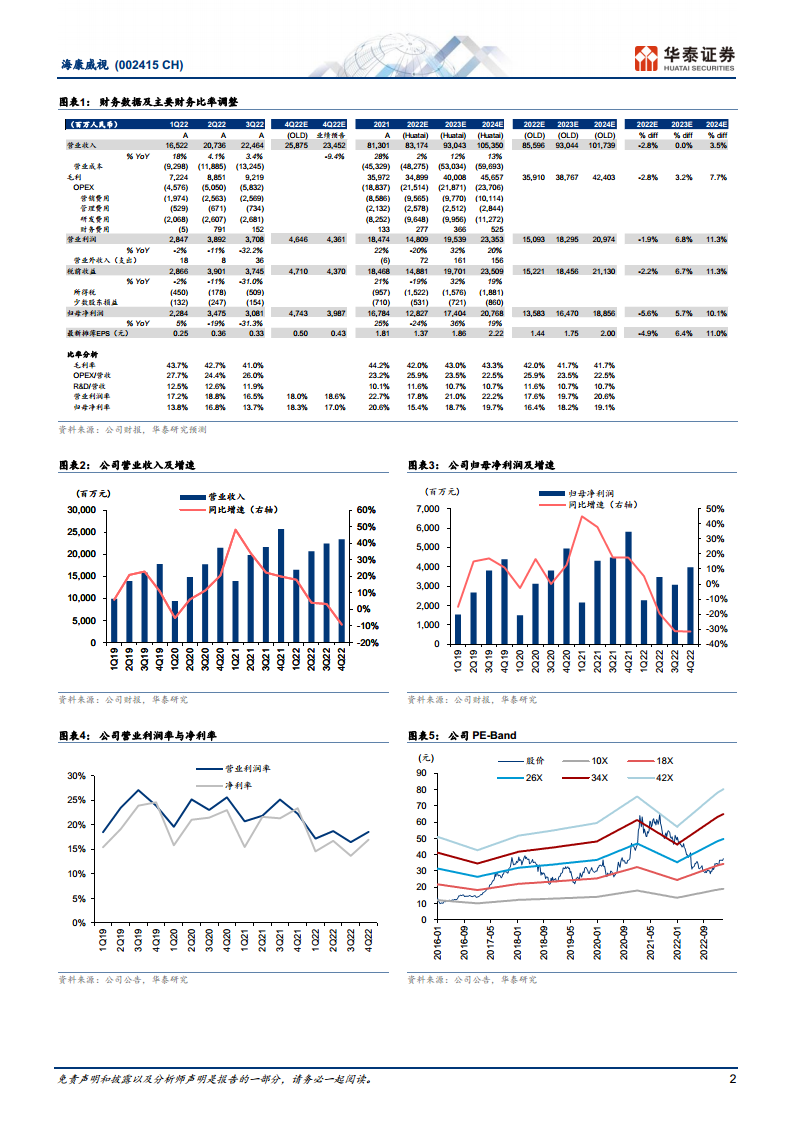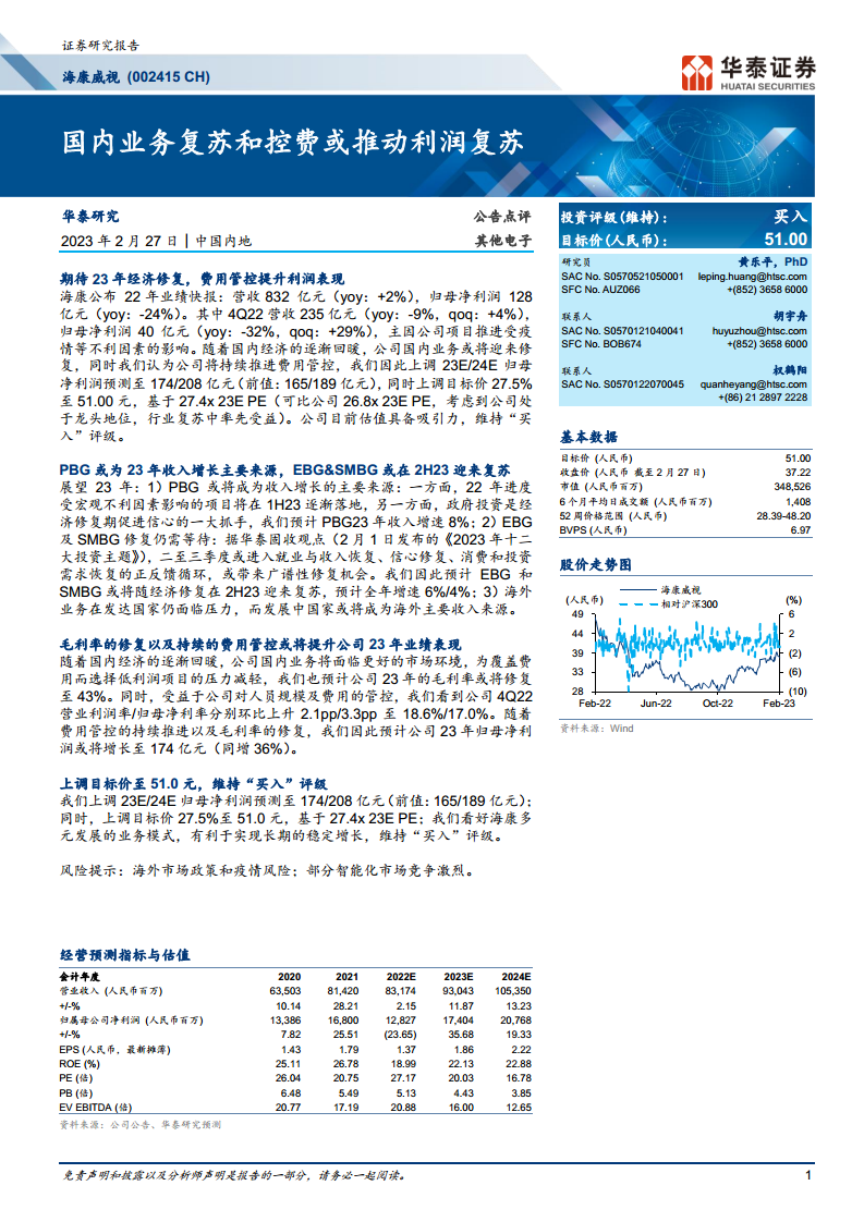 基于对海康威视2023年和2024年盈利能力的乐观预期,华泰研究上调了其归母净利润预测。2023E归母净利润预测从165亿元上调至174亿元,2024E归母净利润预测从189亿元上调至208亿元。同时,目标价也上调了27.5%至51.00元人民币。这一目标价是基于27.4倍的2023年预期市盈率(PE),略高于可比公司26.8倍的2023年预期市盈率。报告认为,考虑到海康威视在行业中的龙头地位以及在行业复苏中率先受益的潜力,给予其一定的估值溢价是合理的。