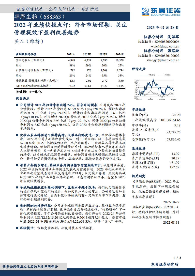 华熙生物2022年业绩快报显示,公司营收和归母净利润分别同比增长28.5%和24.0%,符合市场预期。在化妆品业务方面,公司通过多品牌战略和大单品策略实现了高增长,并逐步将产品定位从成分聚焦转向功效聚焦。原料业务稳步发展,医药级原料贡献显著,而药械业务在经历结构调整后预计将在2023年实现较快增长。随着公司规模效应的提升和管理效率的优化,预计其整体盈利水平将持续改善。基于对公司盈利改善趋势的判断,东吴证券上调了华熙生物2023-2024年的归母净利润预测,并维持“买入”评级。