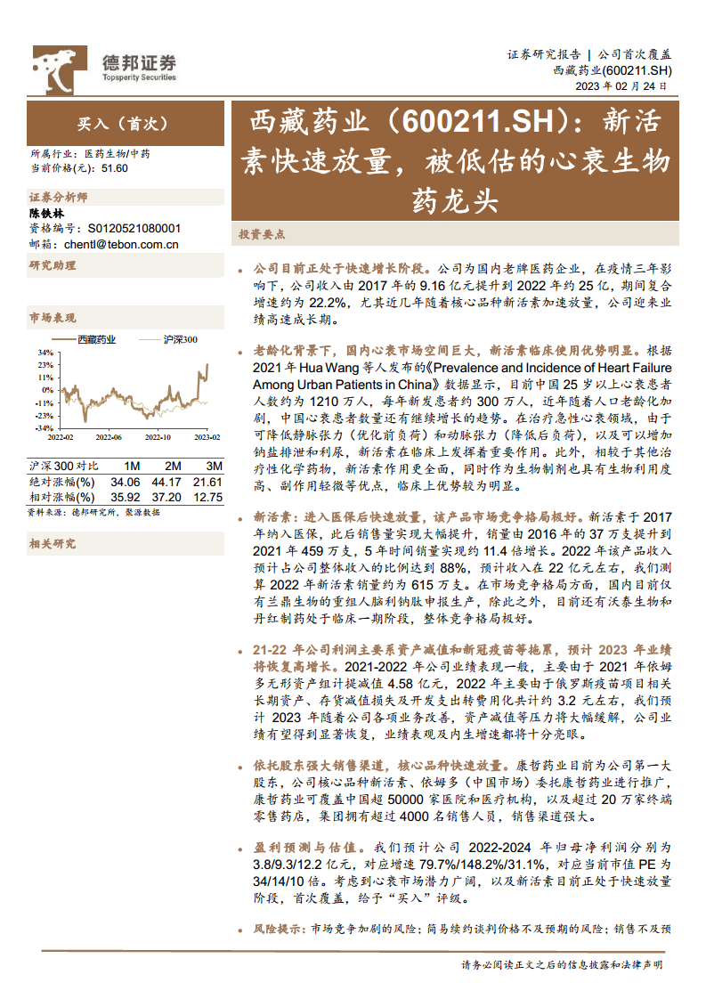 本报告核心观点指出,西藏药业(600211.SH)作为国内老牌医药企业,正处于业绩高速增长期,其核心品种重组人脑利钠肽(商品名:新活素)的快速放量是主要驱动力。在人口老龄化背景下,国内心衰市场空间巨大,新活素凭借其显著的临床优势和极佳的市场竞争格局,在进入医保后实现了销量和收入的爆发式增长。尽管公司在2021-2022年受到资产减值和新冠疫苗项目等因素的短期拖累,但预计2023年将恢复高增长态势。公司依托第一大股东康哲药业强大的销售渠道,进一步巩固了新活素的市场地位。鉴于心衰市场的广阔潜力及新活素的快速放量,报告首次覆盖并给予“买入”评级。