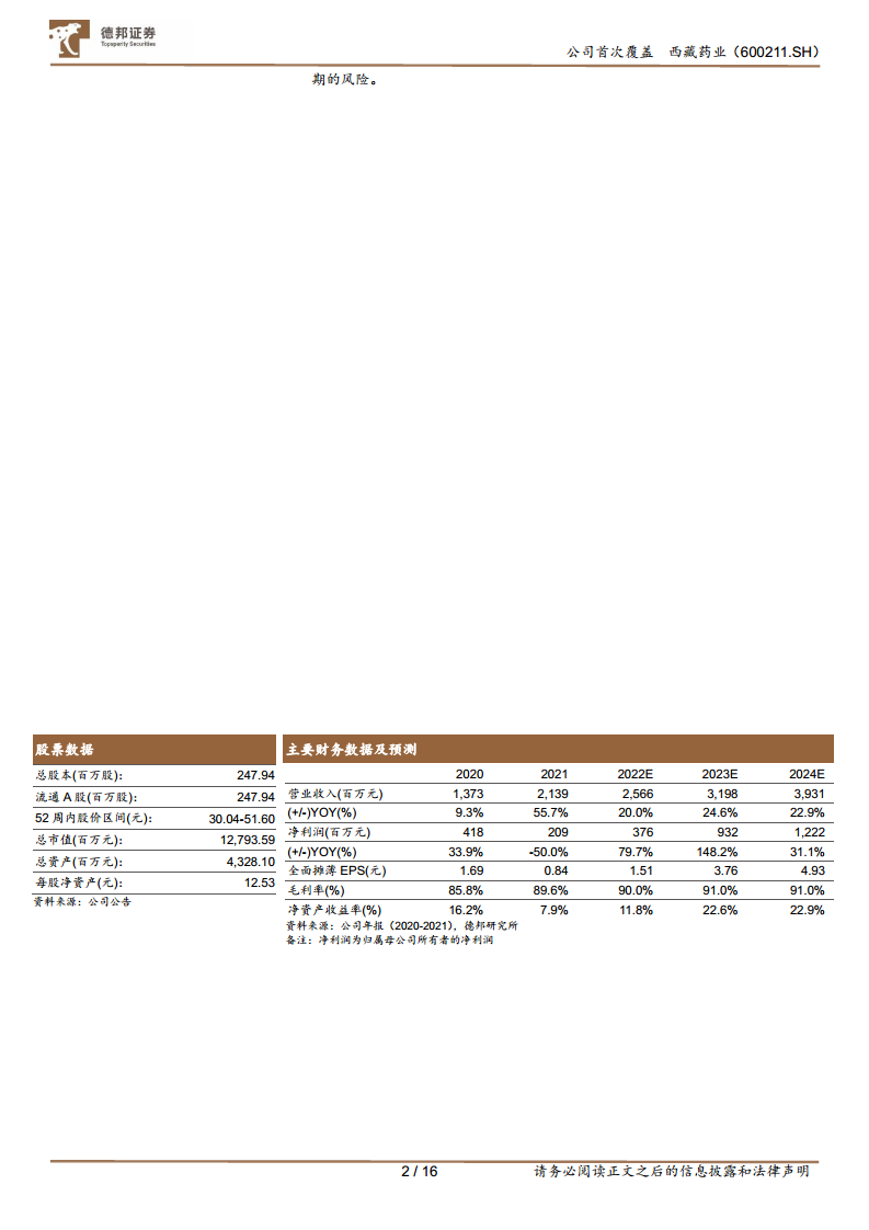 收入预测: 基于上述假设,报告预计西藏药业2022-2024年将实现营业收入分别为25.7亿元、32.0亿元和39.3亿元,同比增速分别为20.0%、24.6%和22.9%。其中,新活素收入在总收入中的占比将持续提升,预计2024年将达到92.74%。