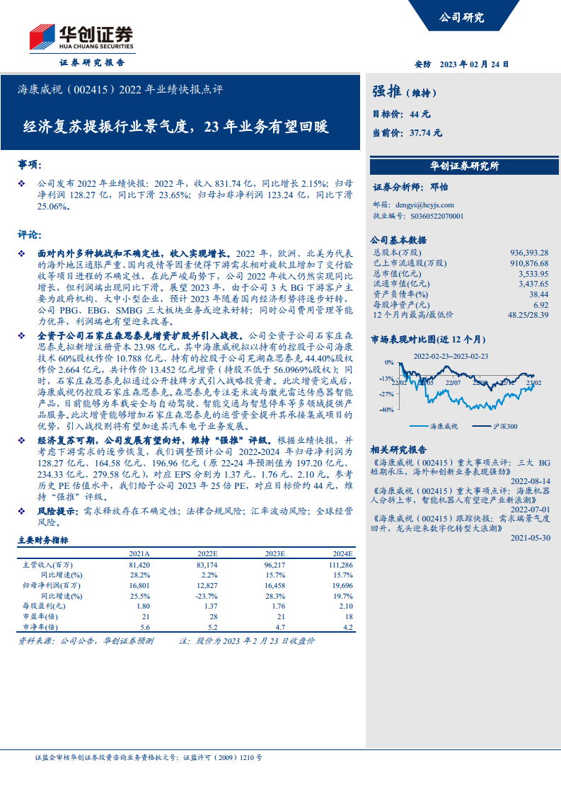 展望2023年,随着国内经济形势逐步好转,海康威视的PBG、EBG、SMBG三大业务板块预计将迎来好转。公司通过对全资子公司石家庄森思泰克进行增资扩股并引入战略投资者,旨在加速其在汽车电子等创新业务领域的发展,进一步提升市场竞争力。华创证券维持“强推”评级,并基于经济复苏预期调整了盈利预测,目标价为44元。