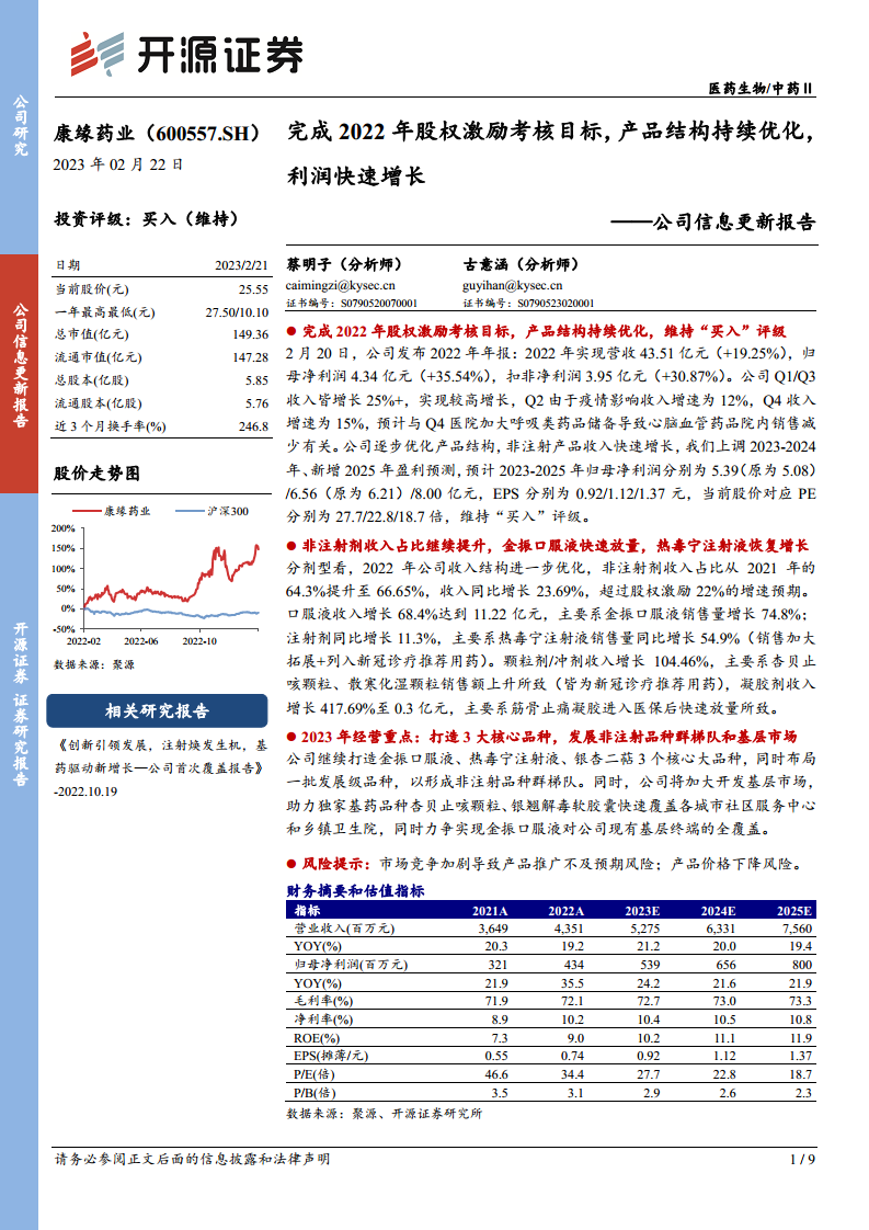 康缘药业(600557)公司信息更新报告:完成2022年股权激励考核目标,产品结构持续优化,利润快速增长