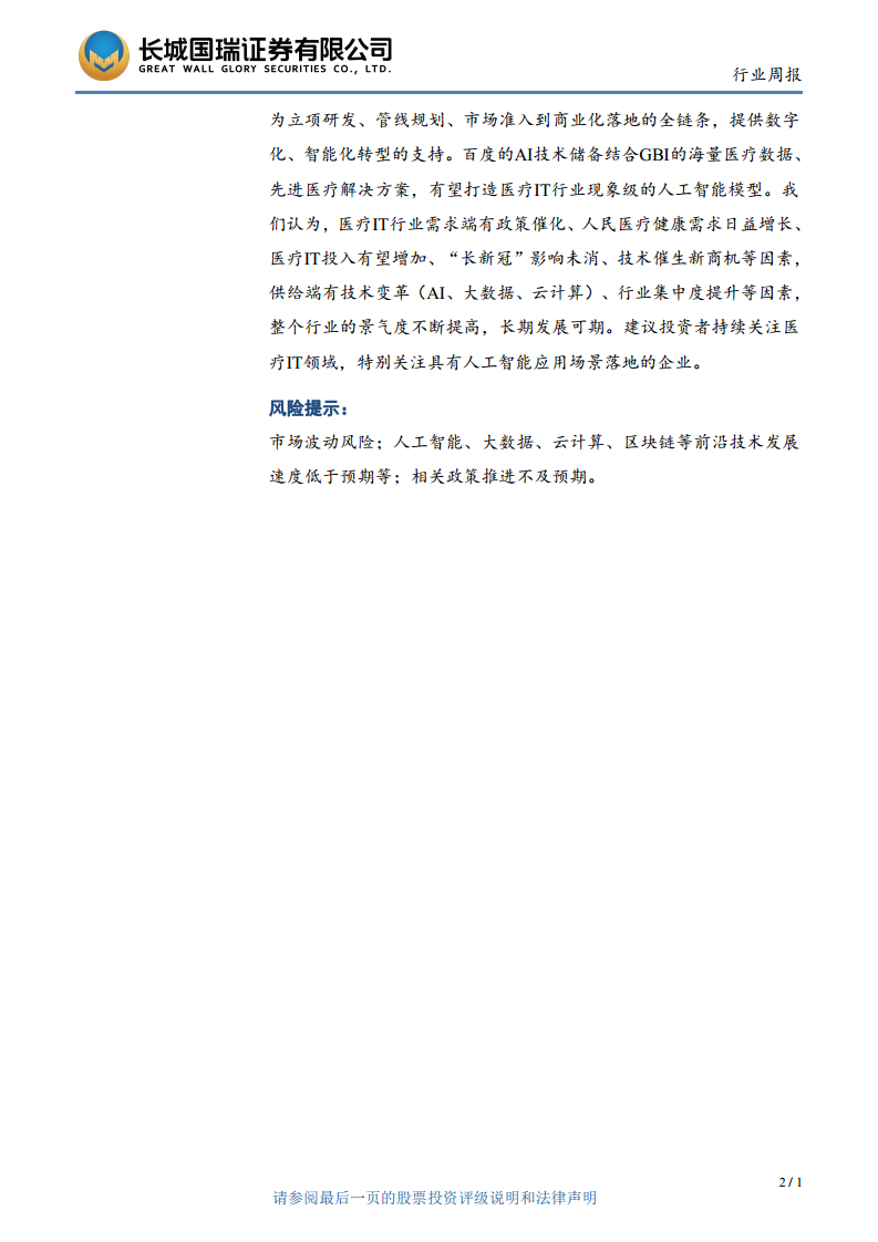 本报告核心观点指出,以ChatGPT为代表的人工智能(AI)技术正以前所未有的速度席卷千行百业,尤其在医疗健康领域展现出巨大的赋能潜力。百度通过并购医疗数据情报提供商GBI,旨在构建“AI+医疗大数据智能化全链条洞察”能力,为生物医药、医疗器械、CRO及医疗投资等企业提供数字化、智能化转型支持。这预示着医疗IT行业在政策催化、人民健康需求增长、IT投入增加、技术变革(AI、大数据、云计算)以及行业集中度提升等多重因素驱动下,景气度持续走高,长期发展前景广阔,建议投资者重点关注具有人工智能应用场景落地的企业。