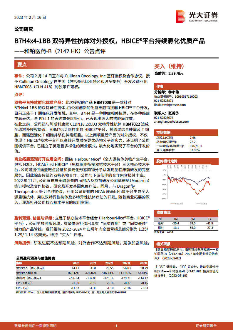 和铂医药-B(02142)公告点评:B7H4x4-2BB双特异性抗体对外授权,HBICE平台持续孵化优质产品