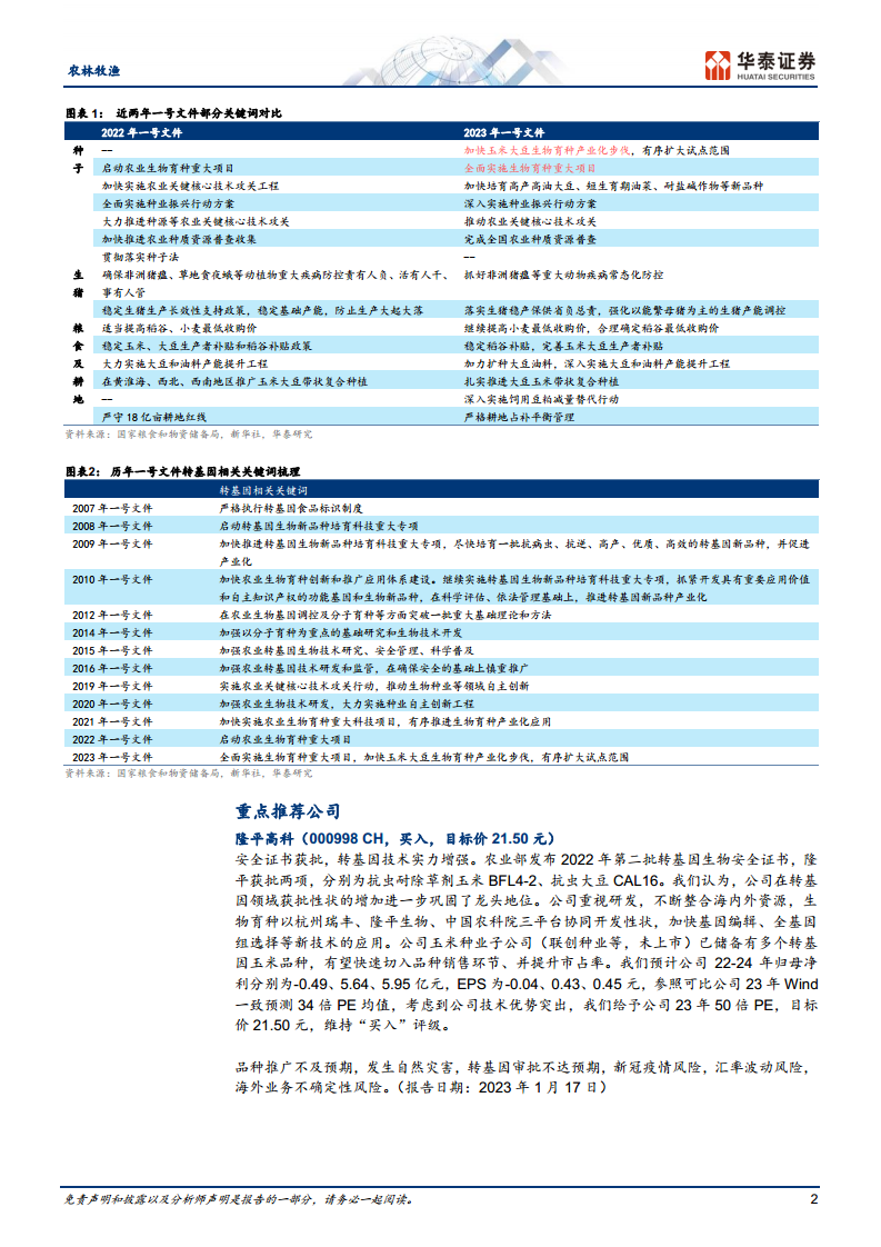2023年中央一号文件发布,明确将“加快玉米大豆生物育种产业化步伐”作为重点工作,标志着生物育种政策导向发生实质性转变,预示转基因品种商业化落地进程有望加速。同时,文件持续强调粮食安全和种业振兴,通过多项政策措施支撑粮价高位运行,预计将拉动传统种业景气度加速回升。此外,生猪产能调控责任主体进一步明确,有望引导生猪生产有序化,减少价格剧烈波动。本报告坚定推荐受益于政策红利和技术进步的种子板块,以及具备成本优势的生猪养殖龙头企业。