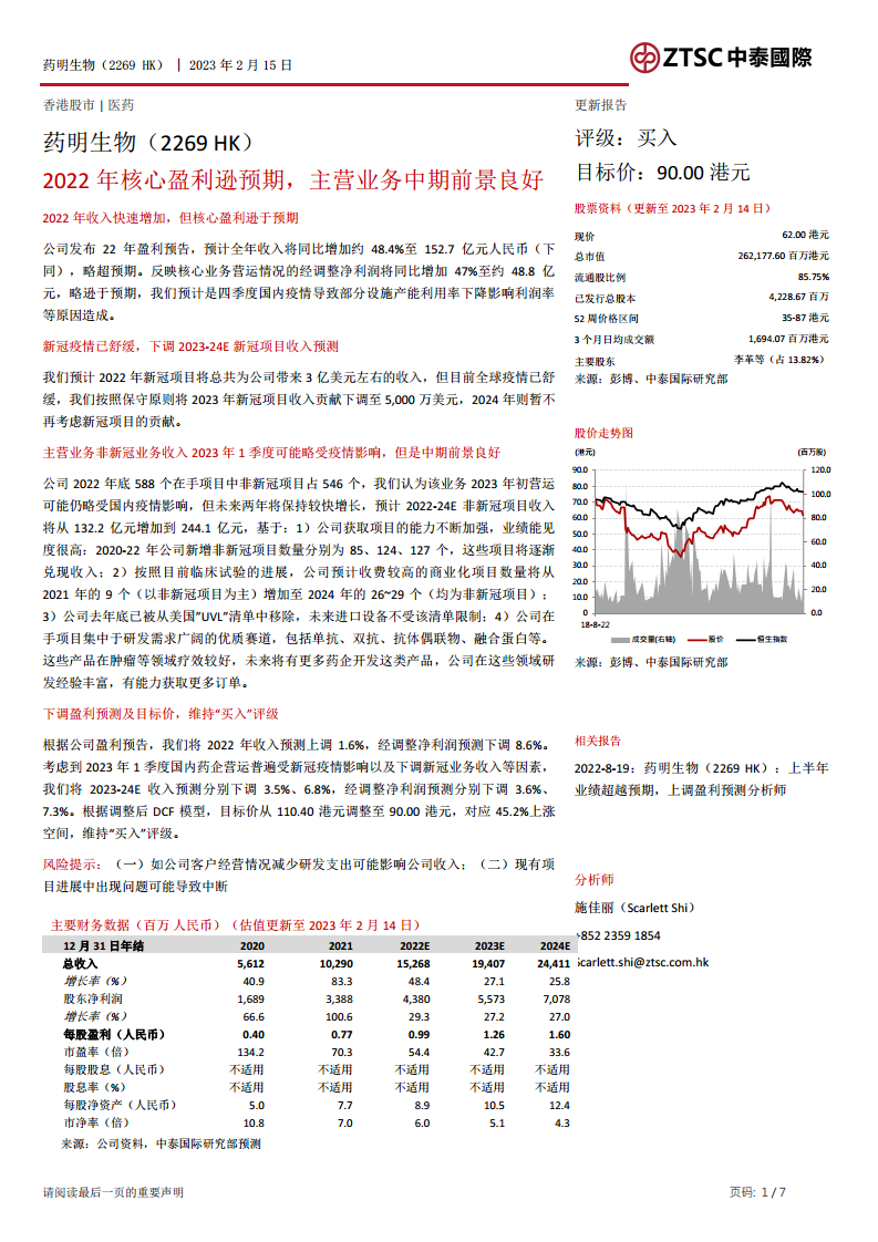 药明生物在2022年实现了强劲的收入增长,但核心盈利略低于预期,主要受国内疫情影响。尽管新冠业务收入预测因疫情缓解而下调,但公司非新冠主营业务展现出良好的中期增长前景,得益于其强大的项目获取能力、商业化项目数量的增加以及“UVL”清单移除等积极因素。分析师据此调整了盈利预测和目标价,但鉴于非新冠业务的稳健增长潜力,维持了“买入”评级。投资者需关注客户研发支出变化及项目进展风险。