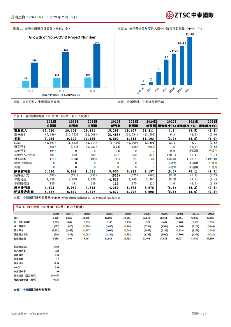 鉴于全球新冠疫情的逐步舒缓,报告对药明生物的新冠项目收入预测进行了保守调整。2022年,新冠项目预计为公司贡献约3亿美元的收入。然而,出于谨慎原则,2023年新冠项目收入贡献被大幅下调至5000万美元,而2024年则暂不再考虑新冠项目的贡献。这一调整反映了市场对疫情相关业务需求减弱的预期。