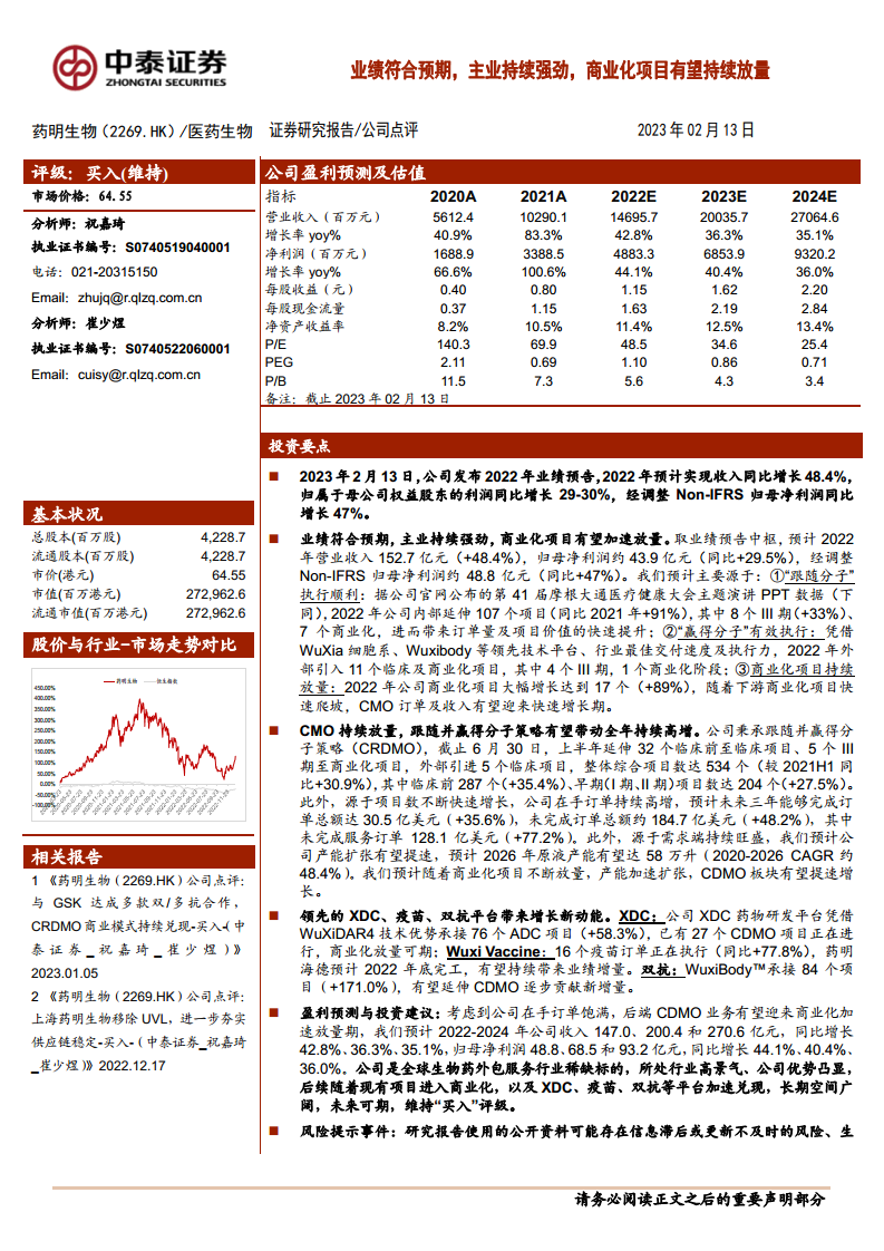 药明生物2022年业绩表现符合预期,核心业务持续强劲增长,主要得益于其成功的CRDMO策略,包括“跟随分子”和“赢得分子”的有效执行,以及商业化项目的加速放量。公司在XDC、疫苗和双抗等创新技术平台上的领先优势,为未来增长提供了新动能。在手订单的持续高增和产能的加速扩张,进一步巩固了其在CDMO领域的市场地位。尽管存在生物药行业景气度下降、项目数量不及预期、核心技术人员流失和汇率波动等风险,但鉴于公司在行业中的稀缺性和广阔的长期发展空间,维持“买入”评级。