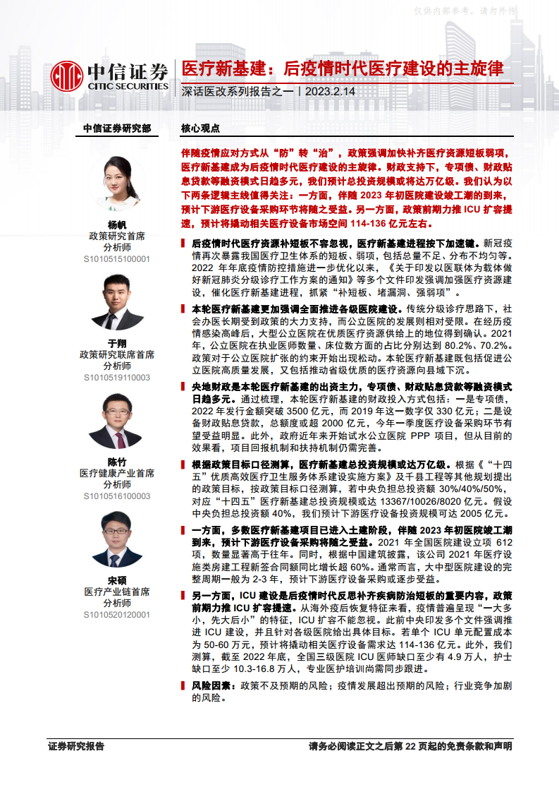报告强调了两条值得关注的投资逻辑主线:一方面,随着2023年初医院建设竣工潮的到来,预计将显著带动下游医疗设备采购市场的受益;另一方面,政策前期大力推动ICU扩容提速,预计将撬动约114-136亿元的相关医疗设备市场空间。同时,报告也指出了医疗新基建在资金保障、建设重点、医护人员培养等方面面临的机遇与挑战。