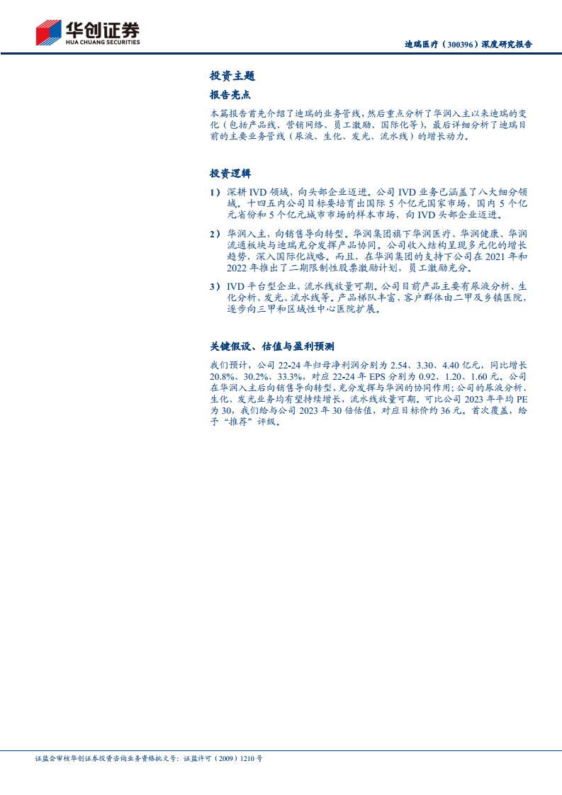 - 迪瑞医疗作为IVD平台型企业,在尿液分析、生化分析、化学发光免疫分析等传统优势领域持续创新,并积极布局高通量流水线产品,其放量增长潜力巨大。