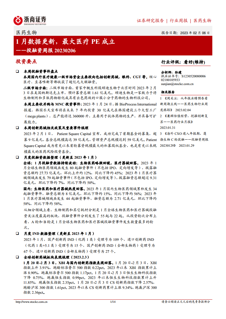 医药生物投融资周报:1月数据更新,最大医疗PE成立
