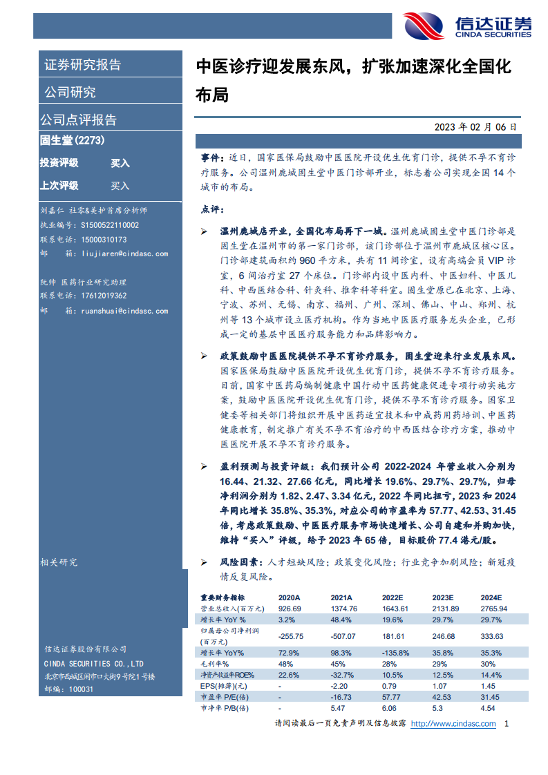 鉴于政策的持续鼓励、中医医疗服务市场的快速增长以及公司通过自建和并购加速扩张的战略,分析师维持对固生堂的“买入”投资评级。基于2023年65倍的市盈率,给予公司目标股价77.4港元/股。