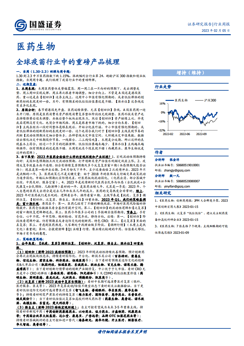 在2023年1月30日至2月3日当周,申万医药指数下跌1.15%,在全行业中排名第24位,表现跑输沪深300指数和创业板指数。本周专题聚焦于全球疫苗行业中的重磅产品梳理,旨在为投资者提供深入分析。