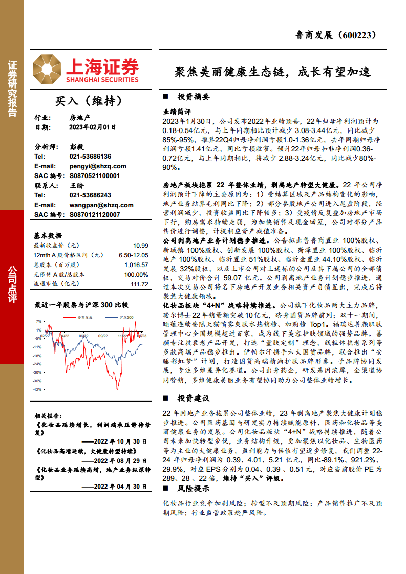 报告指出,2022年公司整体业绩受地产业务拖累,但随着2023年地产剥离和大健康战略的稳步推进,公司盈利能力与估值有望逐步修复。公司医药基因与研发实力持续赋能原料、医药和化妆品等美丽健康业务的发展。
