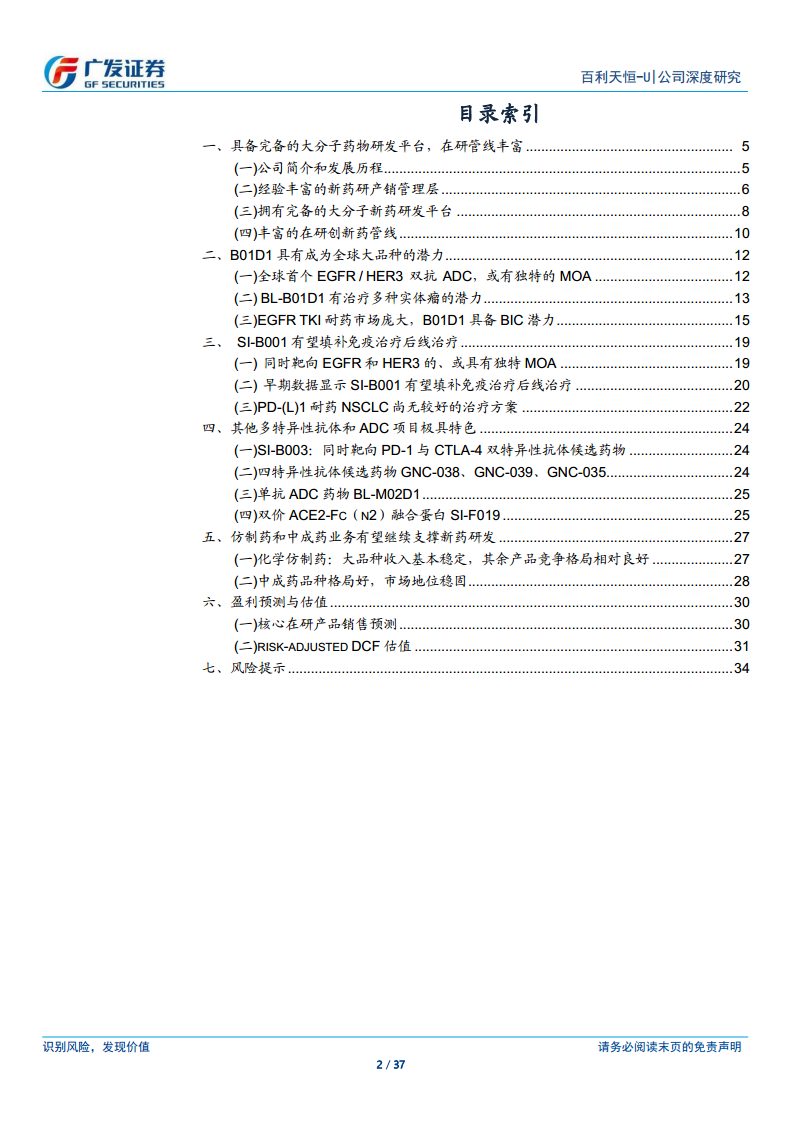 百利天恒-U正积极转型为一家创新生物药企业,凭借其完备的大分子药物研发平台和丰富的创新药管线,尤其是在双/多特异性抗体和ADC药物领域,展现出强大的创新能力和全球竞争力。核心在研产品BL-B01D1和SI-B001在解决EGFR TKI耐药和免疫治疗后线治疗等重大未满足临床需求方面具有巨大潜力,早期临床数据表现亮眼,有望成为全球大品种。尽管仿制药业务面临集采压力,但中成药业务市场地位稳固,为创新药研发提供了持续支撑。基于风险调整后的DCF估值模型,公司合理价值为77.01元/股,首次覆盖给予“买入”评级,但投资者仍需关注新药研发、商业化及政策变化等潜在风险。
