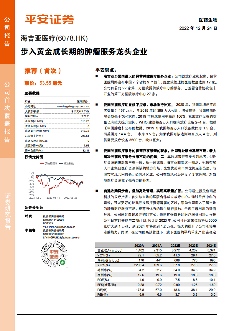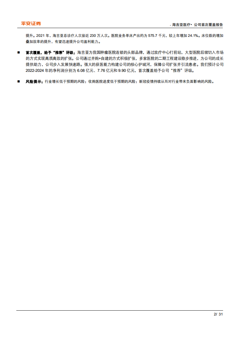海吉亚医疗作为中国民营肿瘤医疗服务领域的领军企业,凭借其前瞻性的市场洞察和高效的运营策略,成功抓住了中国肿瘤医疗市场供不应求和资源分配不均的巨大机遇。公司通过“放疗中心打前站,大型医院后续切入”的独特扩张模式,结合自建与收购并举的策略,迅速扩大了医疗服务网络和床位规模。其卓越的管理整合能力和强大的医生人才培养及引进机制,确保了扩张的质量和盈利能力的持续提升。尽管面临行业增长、收购进度和疫情等风险,但公司清晰的发展路径、稳健的财务表现和核心竞争优势,使其在肿瘤医疗服务赛道上具备显著的成长潜力。报告首次覆盖并给予“推荐”评级,反映了对公司未来发展的积极预期。