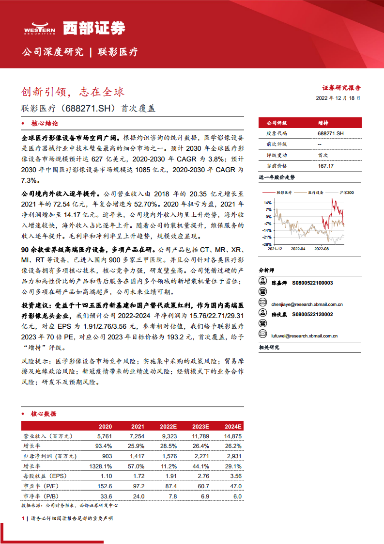 鉴于联影医疗作为高端医疗设备行业龙头企业,具备高研发壁垒、过硬产品力、高性价比产品及完善售后服务,且在研管线丰富,报告首次覆盖并给予“增持”评级。参考相对估值,给予联影医疗2023年70倍PE,对应2023年目标价格为193.2元。