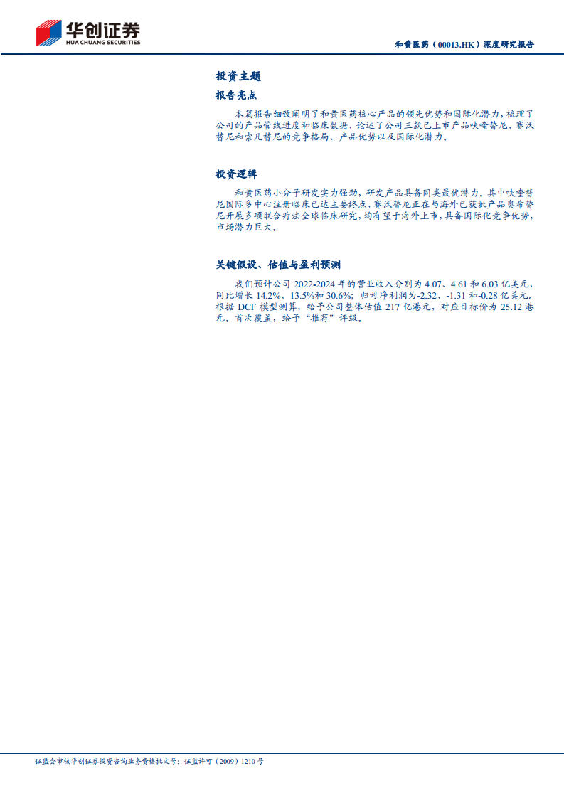 尽管公司目前仍处于研发投入期,预计2022-2024年将持续录得归母净亏损,但其营业收入预计将保持稳健增长,2022-2024年复合增长率达19.4%。创新产品销售额的快速增长,特别是呋喹替尼、索凡替尼和赛沃替尼的销售放量,以及后续血液瘤管线的全面布局,为公司长期发展提供了坚实动力。根据DCF模型测算,公司整体估值达217亿港元,目标价25.12港元,首次覆盖给予“推荐”评级,凸显了市场对其未来增长潜力的认可。