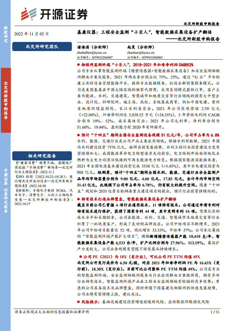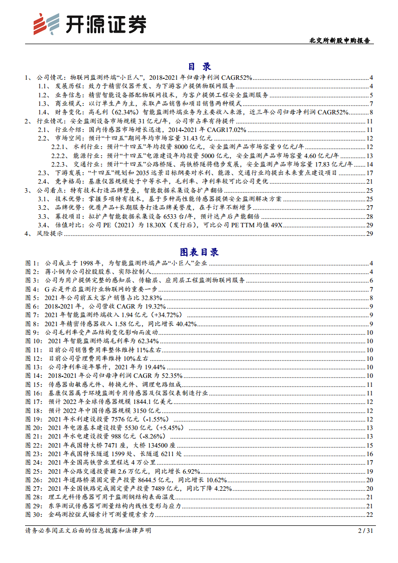 基康仪器作为工程安全监测领域的“专精特新”小巨人企业,专注于智能监测终端(精密传感器与智能数据采集设备)的研发、生产与销售,并提供全面的安全监测物联网解决方案及服务。公司凭借其核心技术和“G云”平台,在能源、水利、交通等关键基础设施领域建立了显著的市场地位。财务数据显示,公司展现出强劲的成长性,2018-2021年归母净利润复合年增长率(CAGR)高达52%,营收复合年增长率也达到19%。