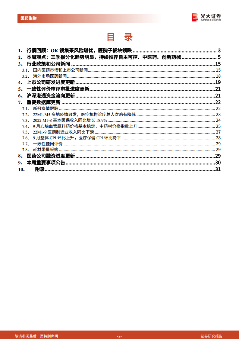本周医药生物行业呈现显著分化态势,第三季度财报显示各子板块业绩表现不一,部分领域受疫情和政策影响承压,而另一些则受益于创新驱动和市场需求。市场对OK镜集采等政策性风险反应强烈,导致相关板块下跌。