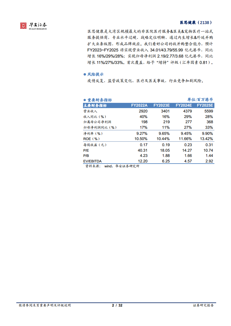 展望未来,在医美市场高景气和宠物医疗蓝海市场的双重驱动下,医思健康有望持续扩大市场份额。报告预计FY2023~FY2025将实现营业收入34.01/43.79/55.99亿港币,归母净利润2.19/2.77/3.68亿港币,分别同比增长16%/29%/28%和11%/27%/33%。首次覆盖给予“增持”评级,肯定了公司在经营管理、市场整合和业务扩张方面的强劲实力。然而,疫情反复、监管政策变化、医疗事故及行业竞争加剧等风险仍需关注。