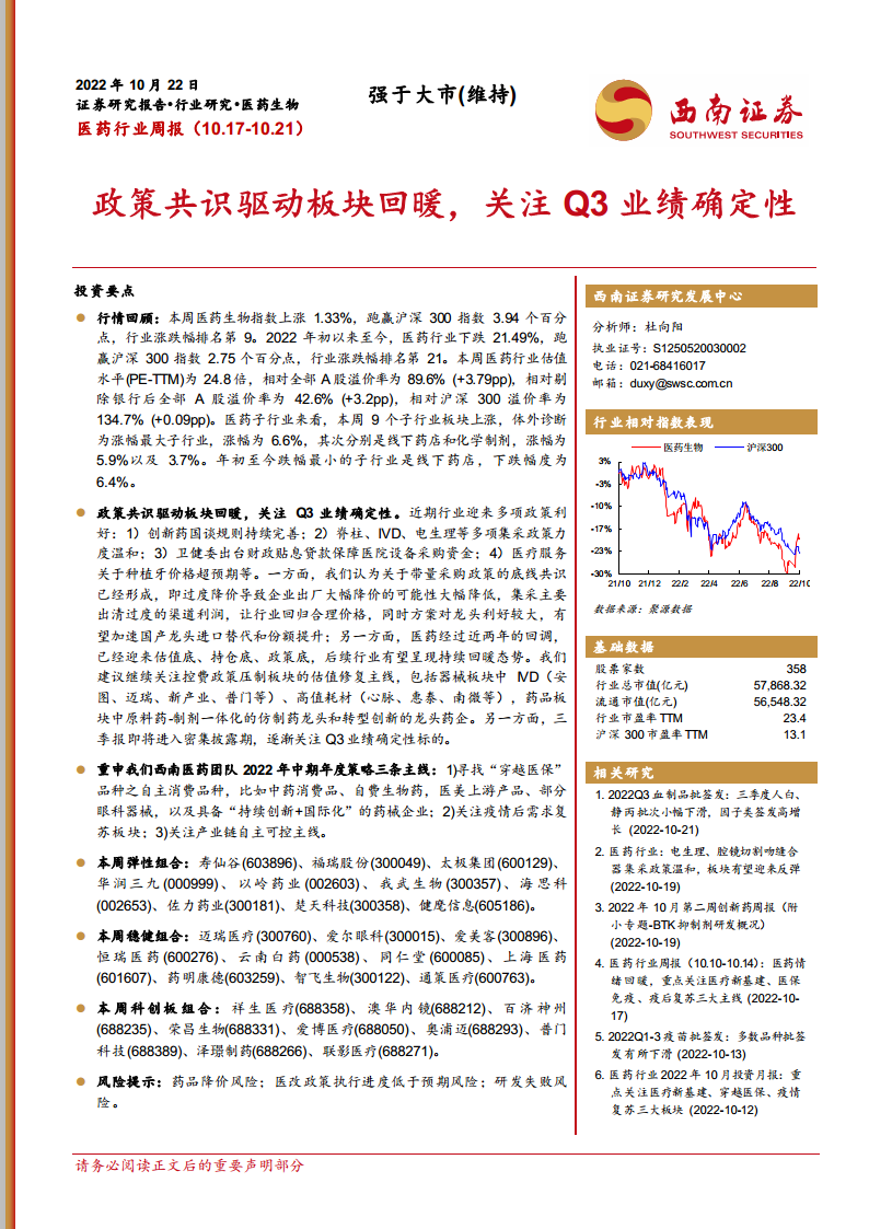 在市场回暖背景下,报告强调投资者应密切关注即将密集披露的三季报中业绩确定性强的标的。同时,报告重申了西南医药团队2022年中期年度策略的三条核心投资主线:一是寻找“穿越医保”的自主消费品种,包括中药消费品、自费生物药、医美上游产品、部分眼科器械以及具备“持续创新+国际化”能力的药械企业;二是关注疫情后需求复苏的板块;三是聚焦产业链自主可控的主线,以应对外部不确定性,保障国内医药产业的韧性与发展。