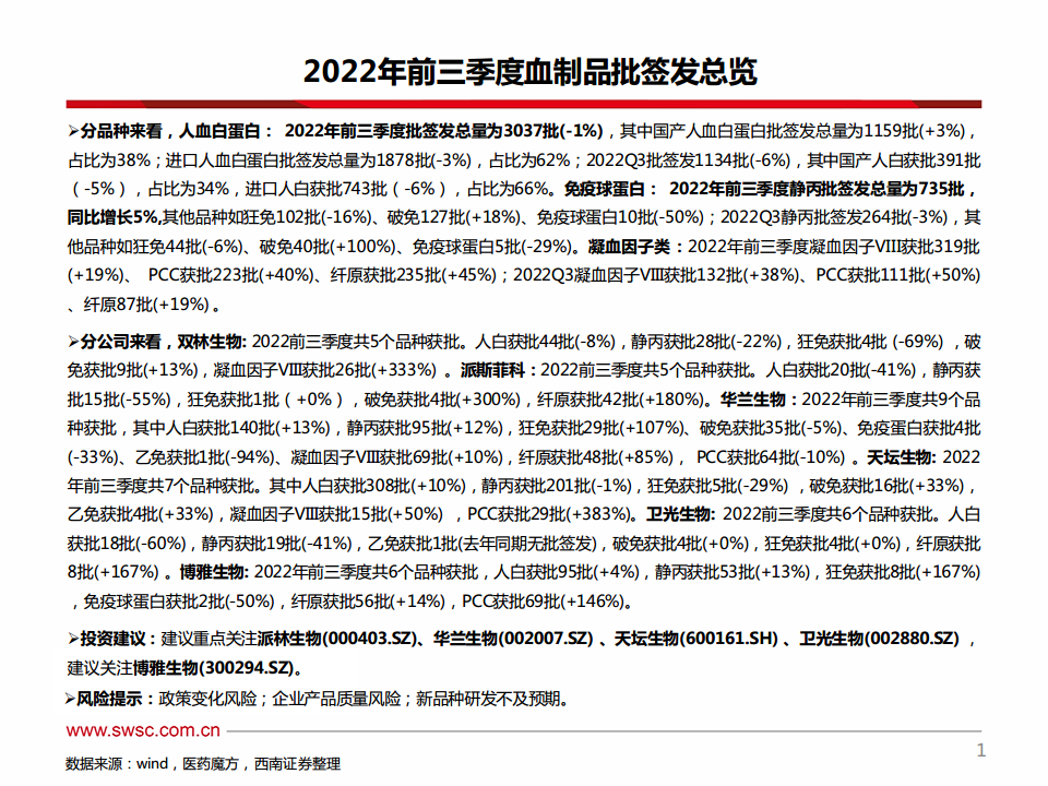 医药:2022Q3血制品批签发:三季度人白、静丙批次小幅下滑,因子类签发高增长