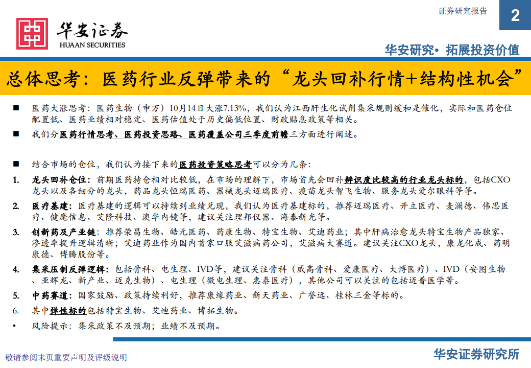 在医药行业回暖的背景下,报告提出了“龙头回补行情+结构性机会”的投资策略。具体而言,市场将首先回补那些辨识度高、业绩稳健的行业龙头企业,涵盖CXO、医疗器械、疫苗、医疗服务等多个细分领域。同时,报告强调了医疗新基建、创新药及产业链、集采压制反弹逻辑下的高值耗材和IVD、以及中药赛道等结构性投资机会。这些策略旨在捕捉行业整体复苏中的确定性增长和政策红利带来的特定机遇。