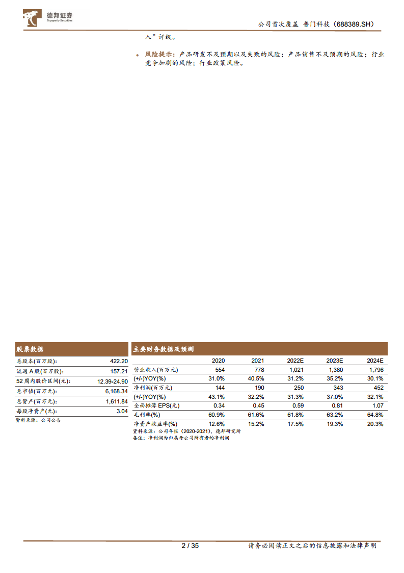 风险提示包括:产品研发不及预期以及失败的风险;产品销售不及预期的风险;行业竞争加剧的风险;以及行业政策风险。