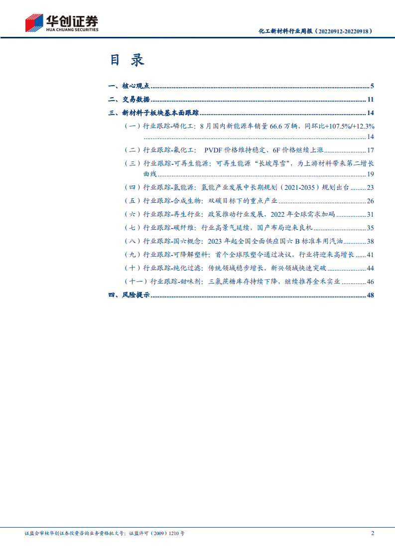 本周华创化工行业指数105.48,环比上涨0.55%,同比下跌1.14%。国际原油价格上升,动力煤价格上涨。本周涨幅较大的新材料品种是三氯氢硅(+4.00%)、环氧树脂(+3.83%)、6F(+2.02%),跌幅较大的品种是磷酸铁(-2.10%)。三氯氢硅因多晶硅新增产能爬坡需求小幅提升;环氧树脂受成本支撑和开工负荷降低影响;6F因原料价格高位和下游锁盐需求增加。本周Wind新材料板块指数周涨幅-6.6%,跑输沪深300(-3.9%)和上证综指(-4.2%),但跑赢申万基础化工指数(-7.3%)。