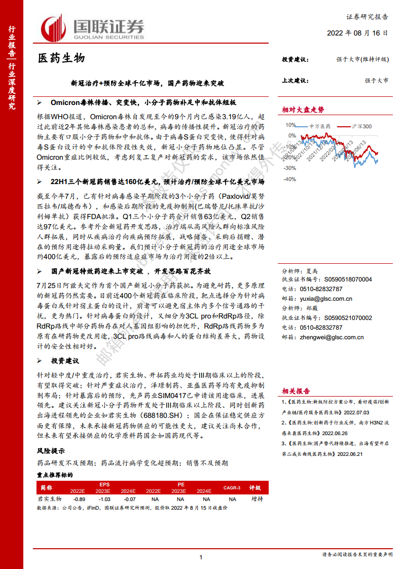 君实生物因其新冠小分子药物VV116的领先进展和PD-1单抗等产品的国际化布局而受到推荐。VV116的III期临床结果积极,有望成为国产新冠药物的重要组成部分。公司预计2022-2024年收入分别为20.63亿/36.93亿/66.42亿,净利润开始减亏。