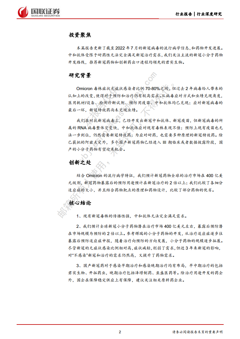 本报告核心观点指出,在全球新冠病毒持续变异、Omicron毒株传播性增强但毒性下降的背景下,针对轻中症患者的小分子抗病毒药物市场需求日益凸显。由于中和抗体受限于病毒S蛋白快速突变而阶段性失效,口服小分子药物的地位显著提升,预计全球治疗市场规模可达400亿美元,若计入暴露后预防适应症,市场规模将超过千亿美元。