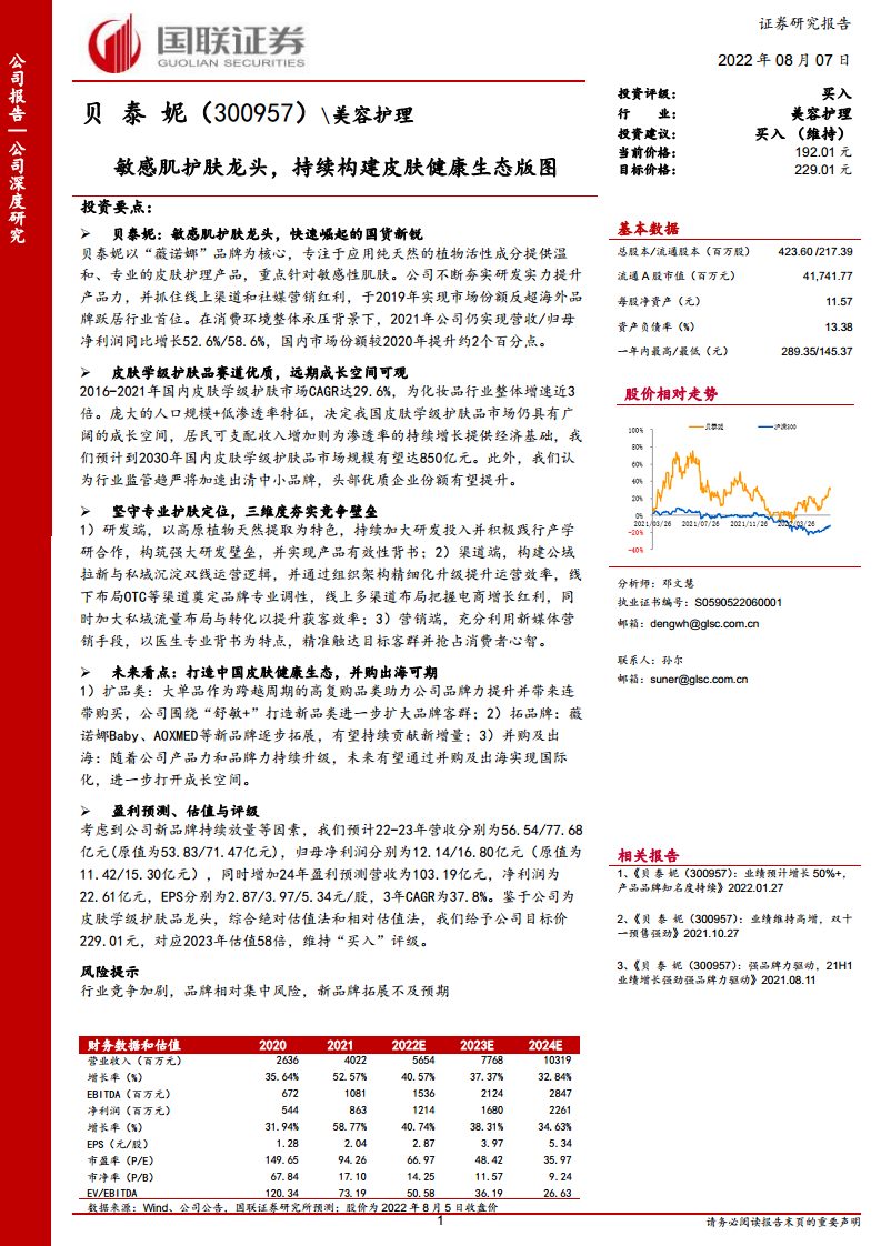 贝泰妮作为中国敏感肌护肤市场的领导者,凭借其核心品牌“薇诺娜”在产品研发、渠道拓展和营销策略上的卓越表现,实现了营收和利润的持续高速增长。公司以高原植物特色护肤为核心,通过医研共创构建了强大的产品力壁垒;同时,线上线下协同发力,并积极布局私域流量,有效提升了获客效率和用户粘性。在营销端,精细化投放与医生专业背书进一步强化了品牌形象。面对广阔且快速增长的皮肤学级护肤品市场,贝泰妮正积极孵化“薇诺娜Baby”、“AOXMED”和“Beauty Answers”等新品牌,并逐步推进国际化进程,以构建全面的皮肤健康生态版图。尽管面临行业竞争和品牌集中度等风险,但公司强劲的增长势头、优异的盈利能力以及清晰的未来发展战略,使其具备显著的投资价值,报告维持“买入”评级。