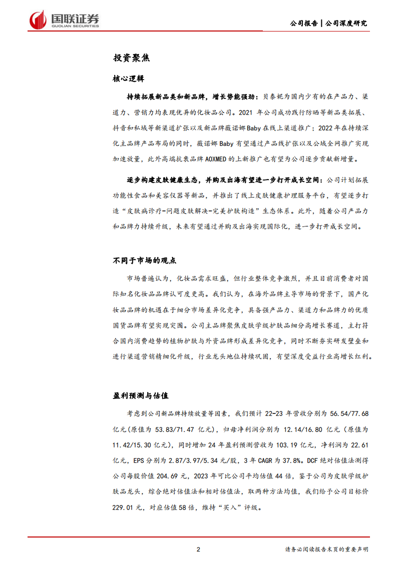 报告采用PEG估值法和FCFF估值法对公司进行估值。考虑到美护行业渗透率快速提升以及头部企业受益行业高增长,PEG估值法给予2023年目标PE为64倍,对应总市值1071.81亿元,每股价格253.32元。FCFF估值法测算得公司股票价值为204.69元/股。综合两种估值方法,报告给予公司目标价229.01元,对应2023年估值58倍,维持“买入”评级。