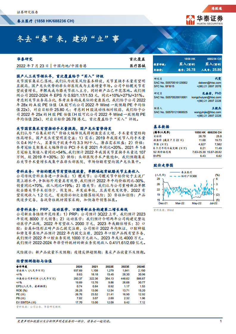 华泰研究首次覆盖给予“买入”评级,A股目标价25.80元(对应2022年28x PE,高于A股可比公司平均22x PE),H股目标价26.78港元(对应2022年25x PE,与H股可比公司平均25x PE持平),反映了对公司作为国产骨科龙头、集采政策风险释放、新产品线提供增长空间以及经营质量的认可。
