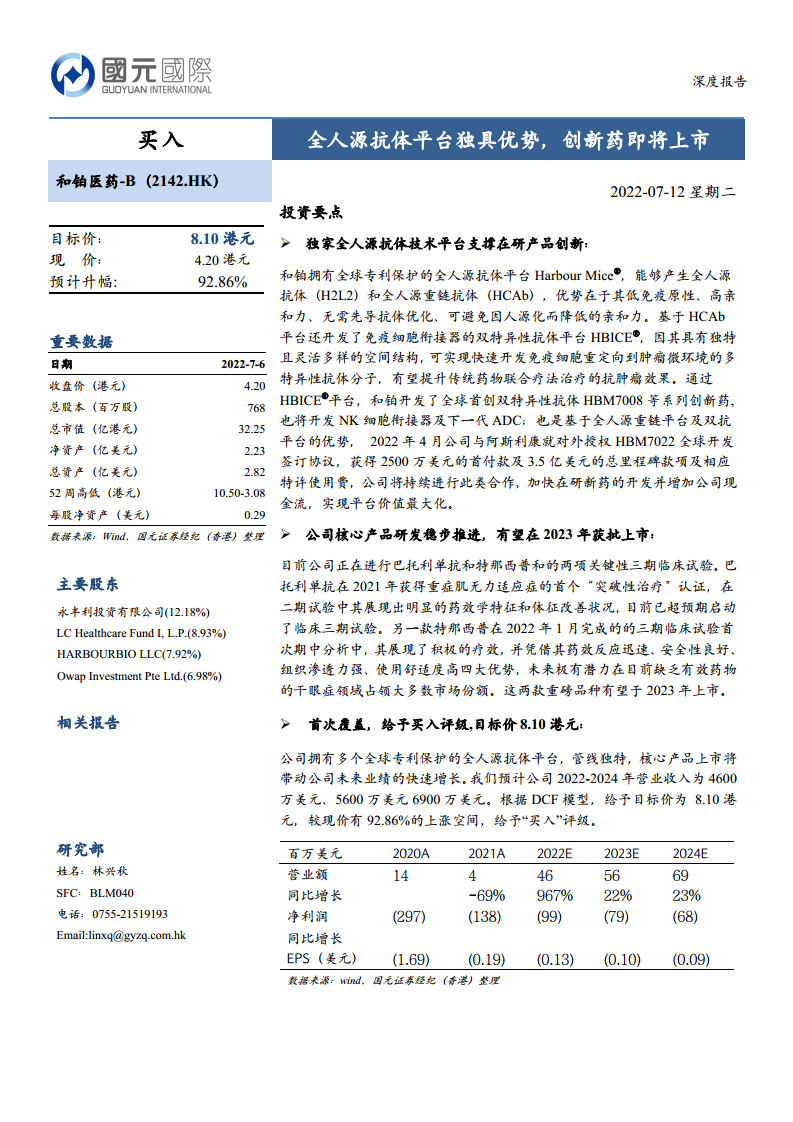 和铂医药-B(2142.HK)凭借其独有的全球专利保护全人源抗体技术平台HarbourMice®及其衍生的HBICE®双特异性抗体平台,构建了差异化且具有“同类首创”或“同类最佳”潜力的丰富创新药管线。公司核心产品巴托利单抗(HBM9161)和特那西普(HBM9036)均已进入关键性临床三期,并有望于2023年获批上市,预示着公司即将进入商业化阶段,实现业绩的快速增长。