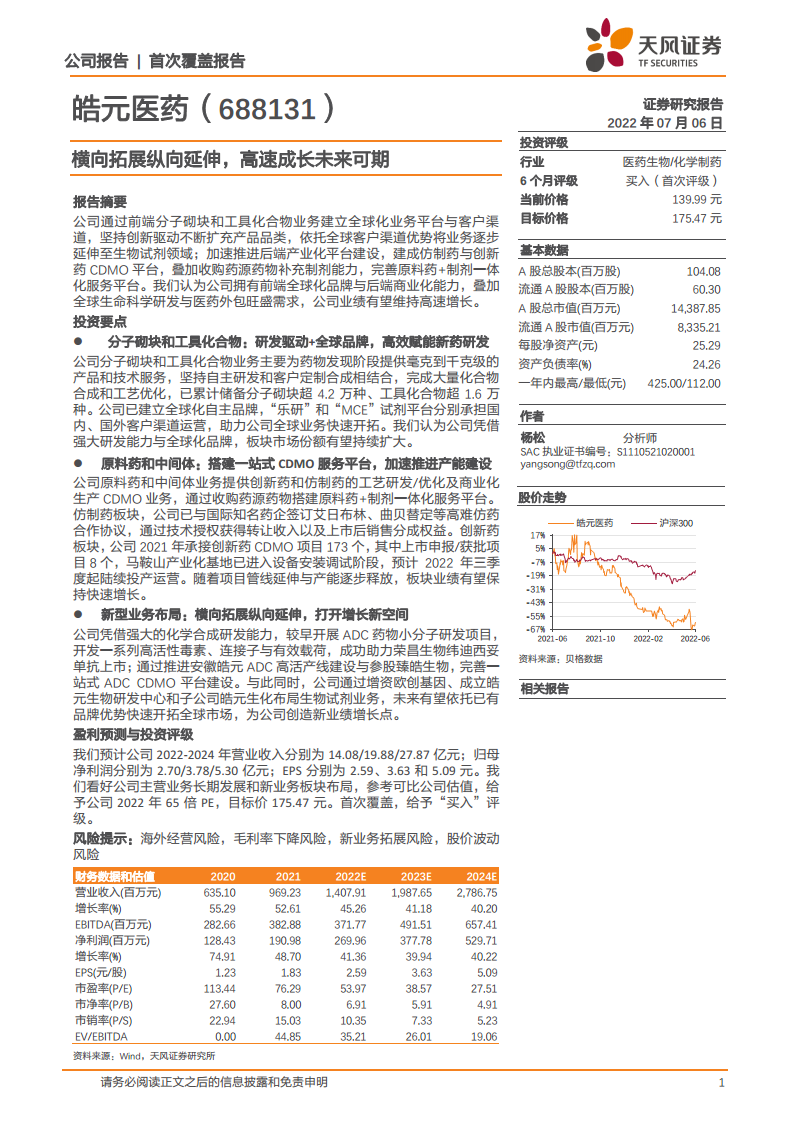 我们采用可比公司估值法,选取药石科技、泰坦科技和阿拉丁作为可比公司。考虑到皓元医药在分子砌块和工具化合物领域的技术能力、产品种类和全球化品牌优势,在原料药和中间体业务领域已实现高难仿药生产与授权以及“原料药+制剂”一站式平台搭建,并在ADC CDMO业务领域助力首款国产ADC药物上市,一体化布局与项目经验均处于国内第一梯队。综合以上因素,我们给予公司2022年65倍PE,目标价175.47元。首次覆盖,给予“买入”评级。