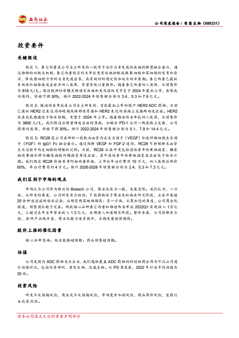 基于对泰它西普适应症(包括已获批的系统性红斑狼疮,以及处于临床III期的视神经脊髓炎频谱系疾病和类风湿性关节炎,预计2024年上市;处于临床II期的原发性干燥综合征、免疫球蛋白A肾病、多发性硬化症、重症肌无力,预计2025-2026年上市)的分析,并参考弗若斯特沙利文报告中的患者人数(例如类风湿性关节炎患者从2020年的500万增长至2025年的620万,复合增长率4.3%),以及医保续约后价格下调30%和每年2%的自然降价,我们预测泰它西普在中国市场的销售峰值将达到29亿元人民币。预计2022-2024年销售额分别为3.37亿元、5.26亿元和7.85亿元。