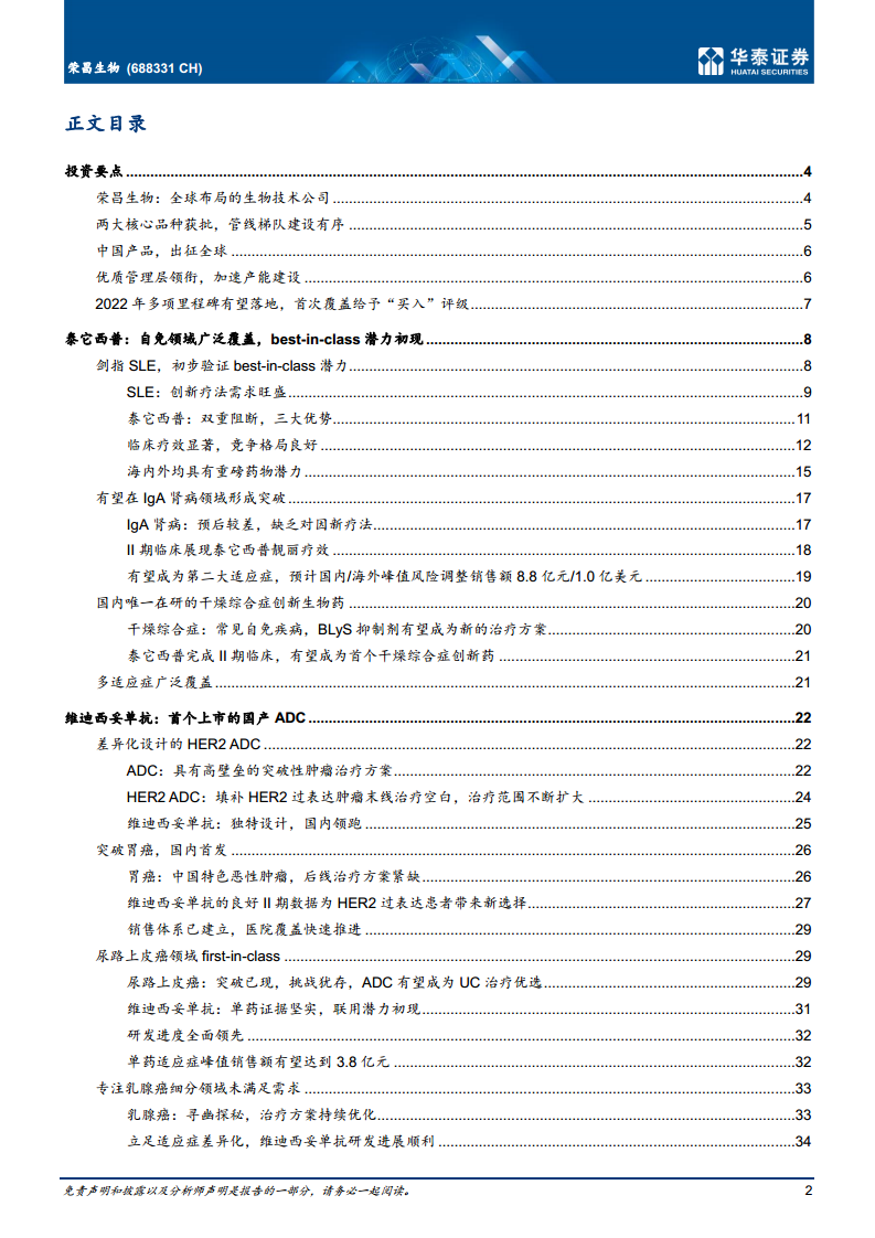 泰它西普(BLyS/APRIL融合蛋白)是公司在自身免疫领域的核心产品。在国内市场,其SLE适应症已于2021年3月获批,并于2021年12月通过国家医保谈判纳入医保,谈判价格为818.8元/80mg,预计2022年年费用约8.5万元,有望加速放量。报告预计泰它西普SLE适应症的国内峰值销售额将达到31.8亿元人民币。在海外市场,泰它西普是目前美国临床进度领先的SLE药物,其全球III期研究已于2022年第二季度启动患者入组,报告预计其海外收入峰值将达到14.5亿美元。