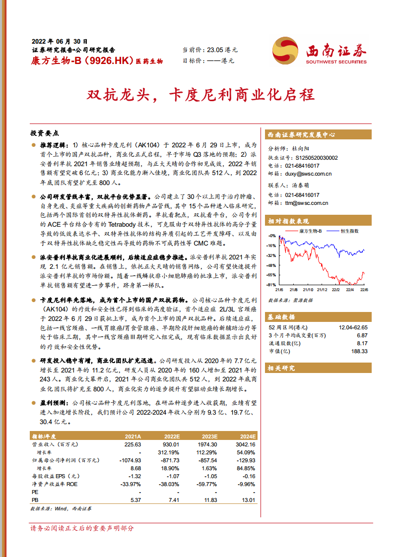 康方生物-B(09926):双抗龙头,卡度尼利商业化启程