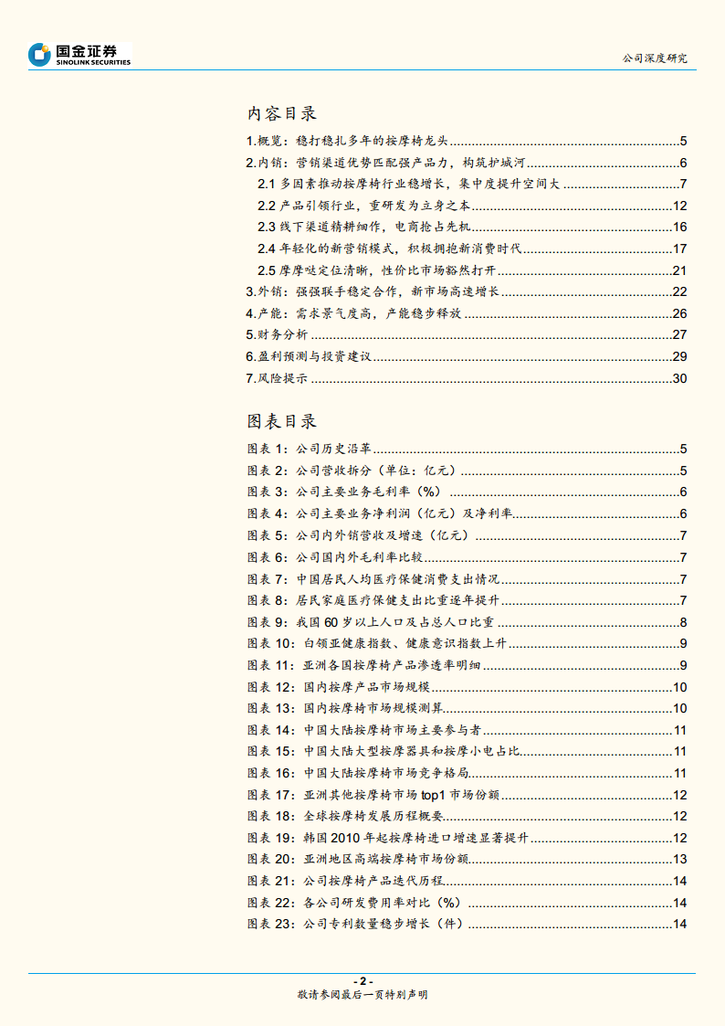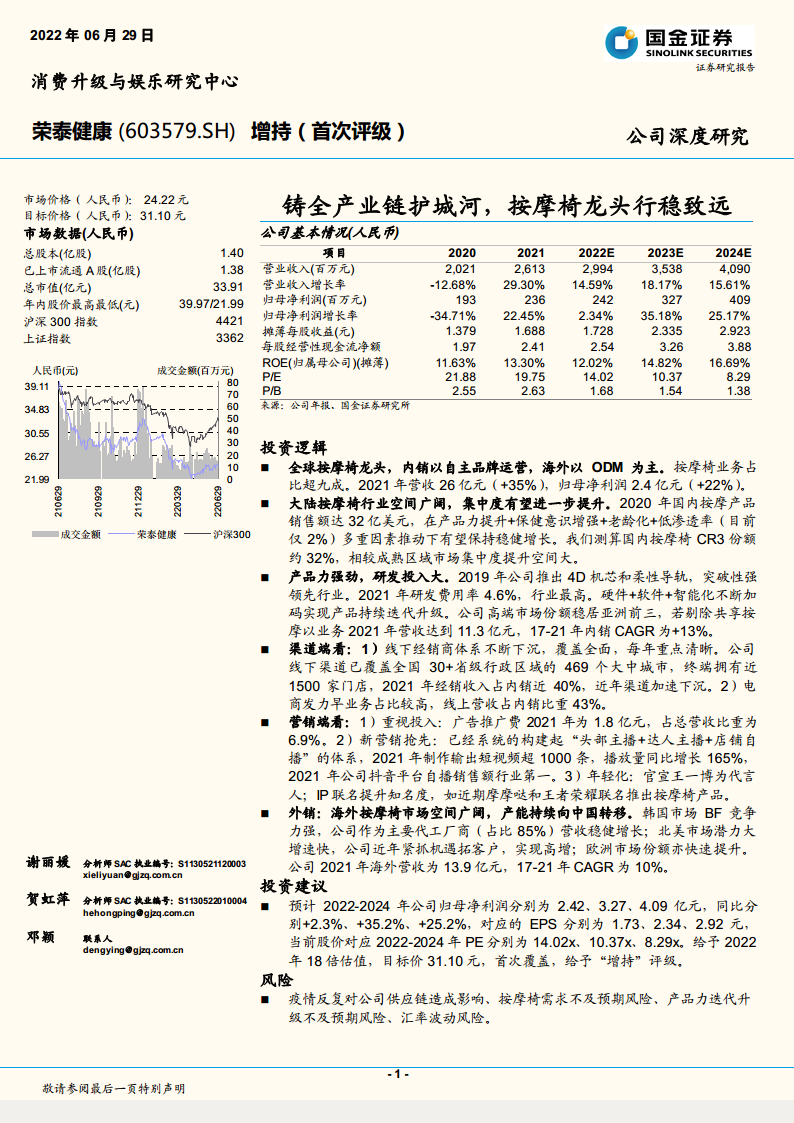 • 基于公司作为按摩椅龙头的地位、稳健的增长前景和持续释放的产能,给予2022年18倍估值,目标价31.10元,首次覆盖给予“增持”评级。