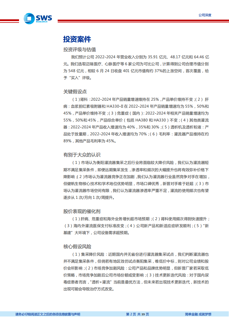 市场对血液灌流器集采的悲观预期被认为过度,报告分析指出灌流器短期内不满足全国集采条件,且随着上海专家共识等推动使用频次的提升,以及肝病、危重症及国际业务等非肾科领域的快速拓展,集采对公司业绩的潜在影响有限。这些多元化增长引擎将优化公司收入结构,降低对单一肾科业务的依赖,并有望带来估值修复。基于对公司未来三年业绩的稳定高增长预测,首次覆盖给予“买入”评级,预计合理市值存在约37%的上涨空间。