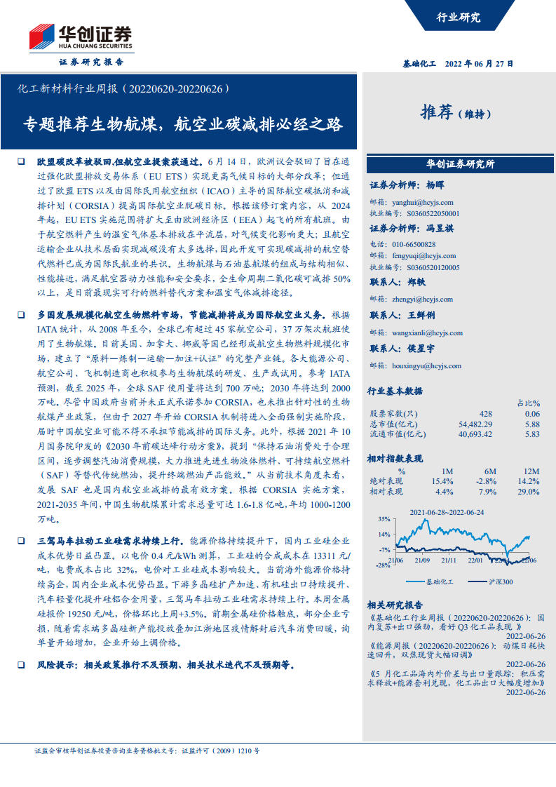 化工新材料行业周报:专题推荐生物航煤,航空业碳减排必经之路