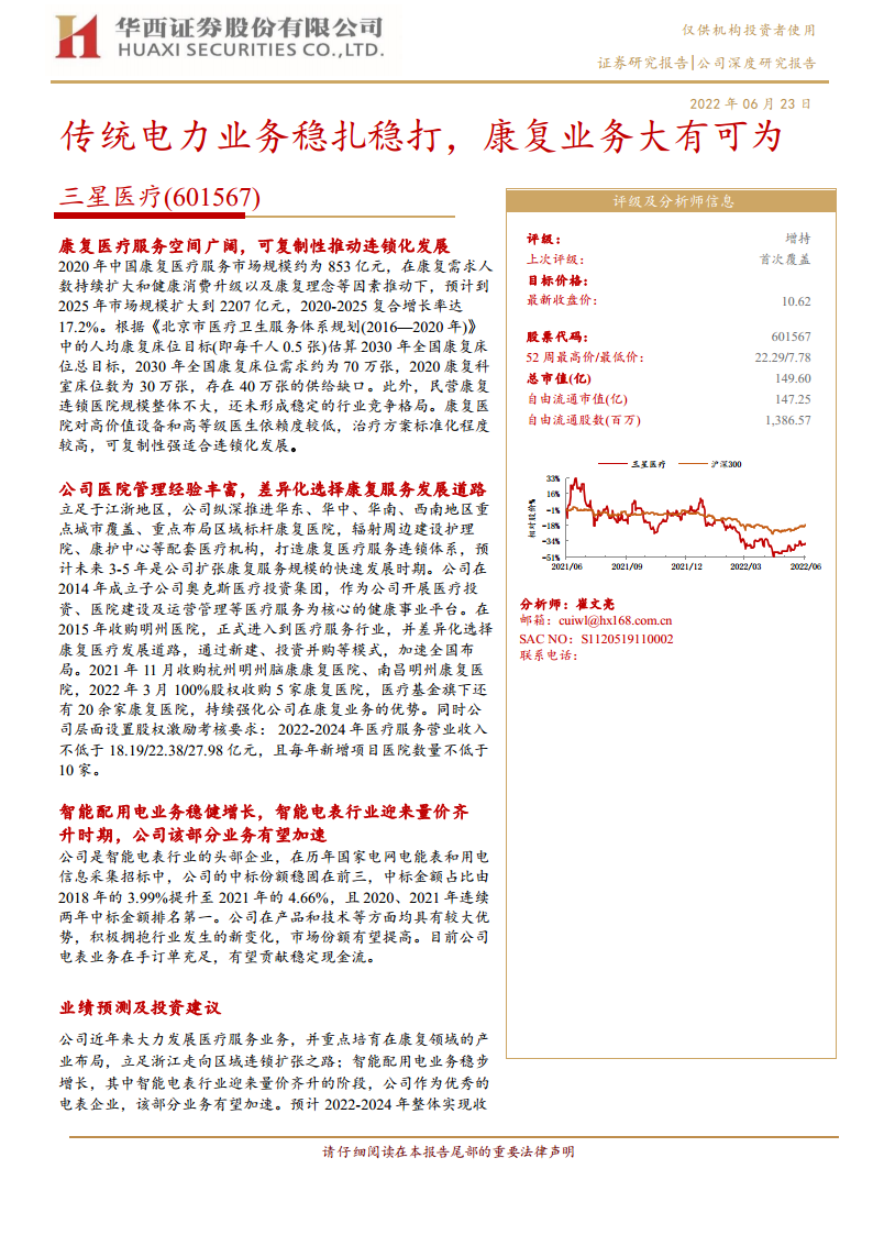 首次覆盖,给予“增持”评级,公司合理市值约200亿元。公司在康复医疗领域的产业布局和区域连锁扩张,以及智能配用电业务在量价齐升阶段的头部优势,将共同推动公司业绩持续增长。